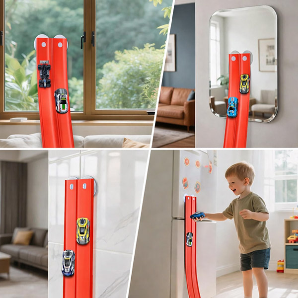 Закрепването с вакуумни вендузи позволява на децата и родителите бързо да променят ъглите и разположенията, така че пистата може да се изгражда отново и отново без инструменти или сложен монтаж.